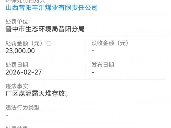 山西昔阳丰汇煤业露天堆放煤泥被罚2.3万