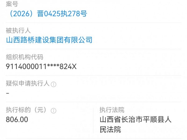 山西路桥建设集团被长治平顺县法院执行806元