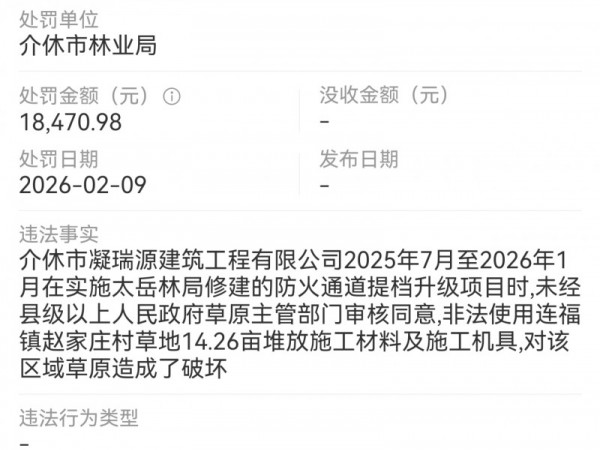 因违法使用草地堆放施工材料和工具 介休凝瑞源建筑被处罚1.8万