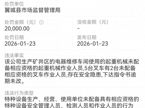 山西翼城首旺煤业被市场监督管理局处罚2万元
