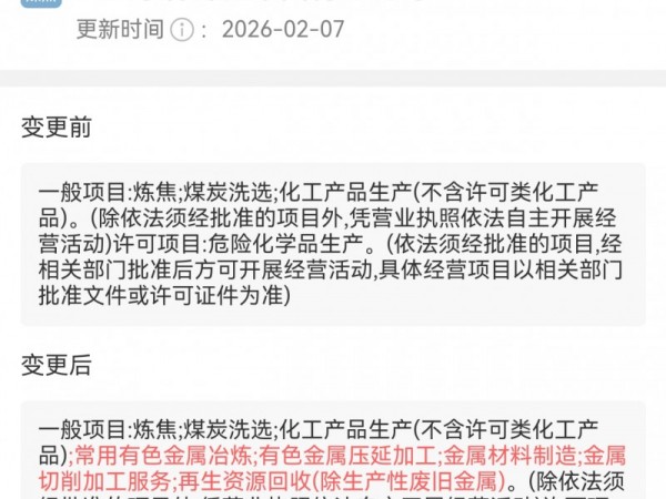 山西永祥煤焦集团经营范围变更 新增金属类业务