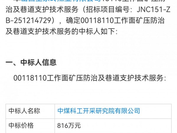 【中煤科工开采研究院816万中标山西王家岭煤业】