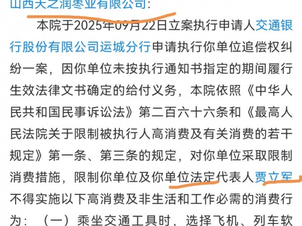 【山西天之润枣业收到限制消费令】