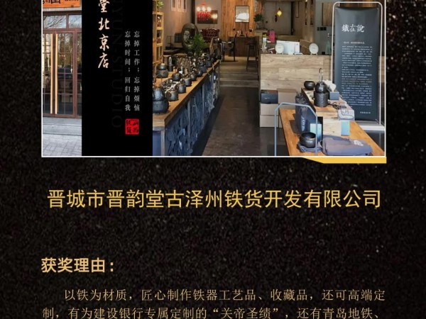 晋城市晋韵堂古泽洲铁货开发有限公司荣获2020年度山西品牌建设典范企业称号