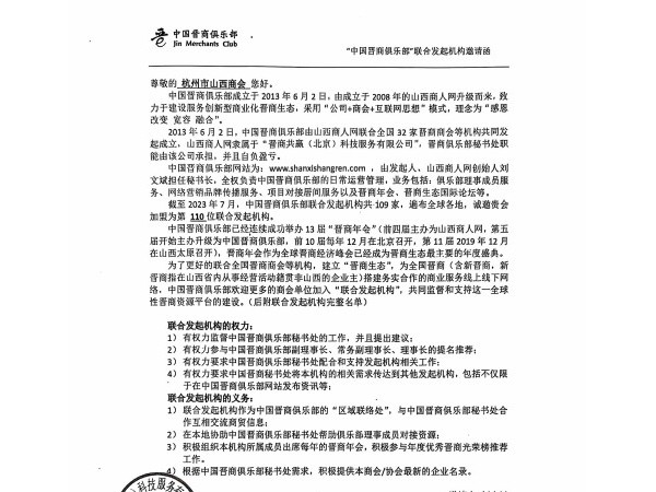 热烈欢迎杭州市山西商会加盟为中国晋商俱乐部第110位联合发起机构