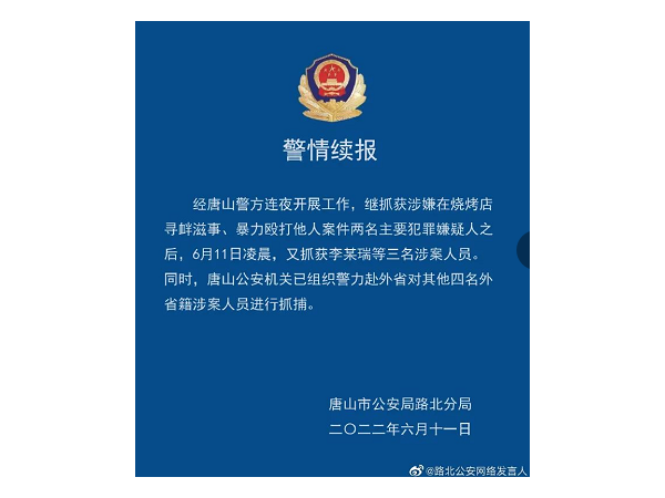 连夜抓获5人!还有4人在逃!唐山烧烤店打人事件最新进展→