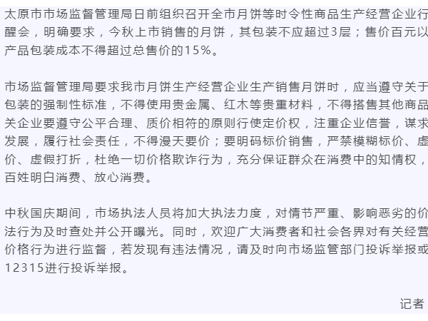 月饼包装不应超过3层!太原市召开规范月饼生产提醒会