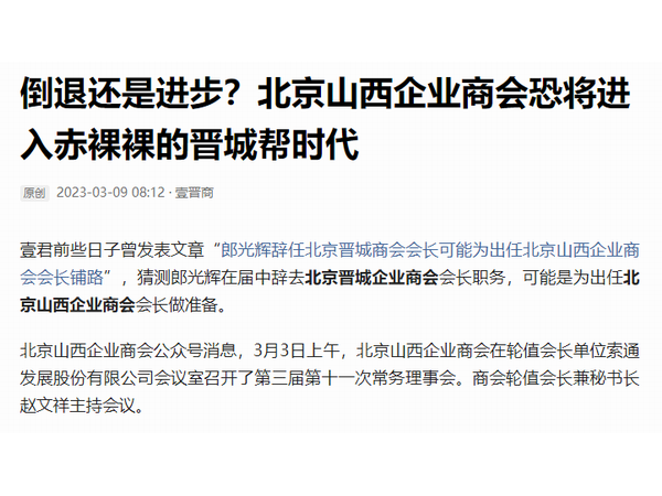 网评 | 倒退还是进步?北京山西企业商会恐将进入赤裸裸的晋城帮时代