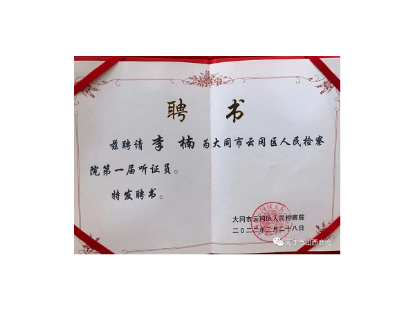 典格瑞达总经理李楠成为大同市云冈区人民检察院首届听证员