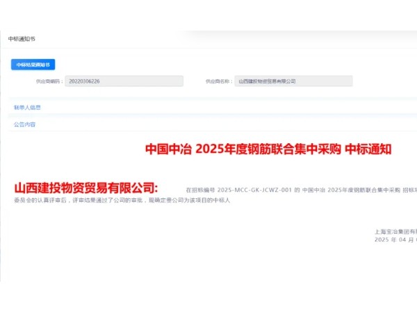 天津市山西商会——山西建投物资贸易有限公司成功中标“中国中冶2025年度钢筋区域联合集中采购项目”