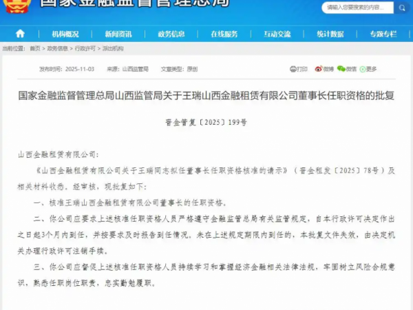 新董事长任职资格获批!山西金租时隔一年多再换帅,由原总经理担任