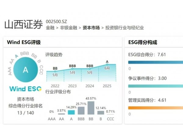 山西证券ESG评级全线跃升 跻身行业第一梯队