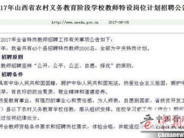 山西为农村学校招聘2000名特岗教师 三年后留任有编制