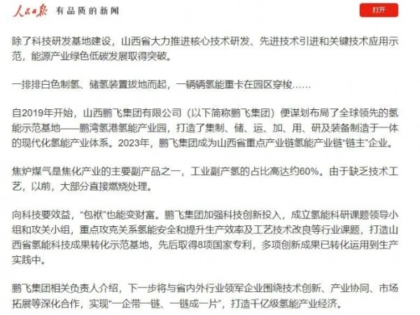 人民日报 :山西争当能源革命排头兵 为保障能源安全贡献三晋力量丨鹏飞氢能倾情助力