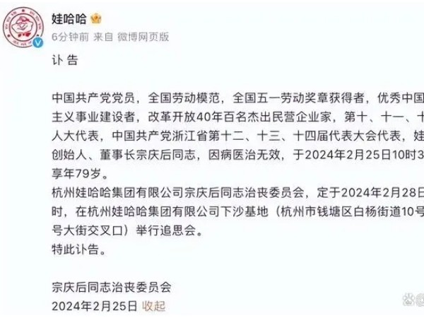 雷军、李书福、周鸿祎、马云等悼念“老大哥”宗庆后
