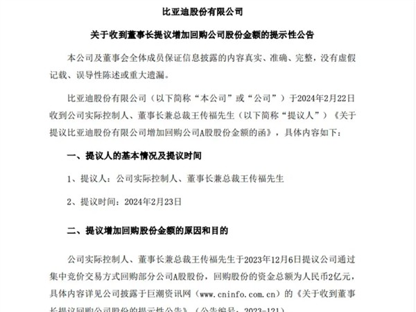 加大股票回购力度:王传福提议将回购金额增加一倍