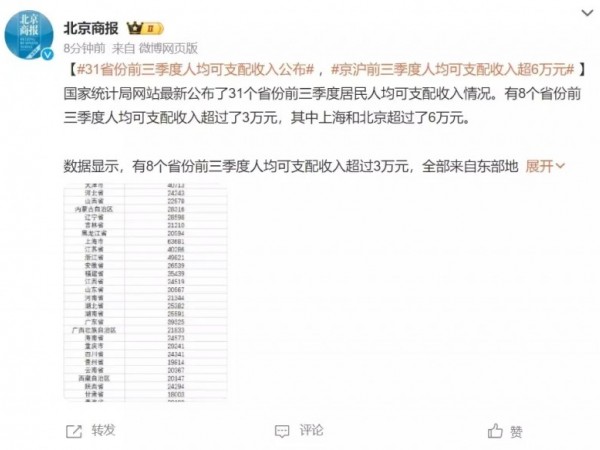 31省份前三季度人均可支配收入公布