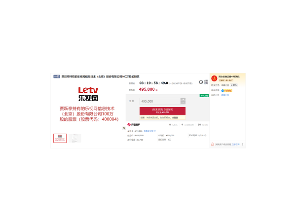 贾跃亭名下乐视网股票又将拍卖,每股0.495元起拍