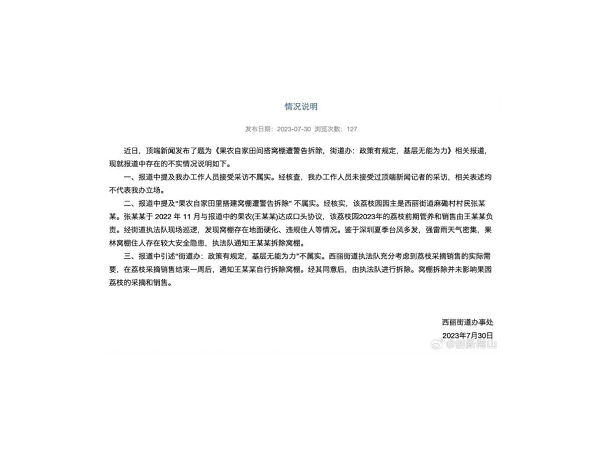 果农自家田间搭窝棚遭警告拆除?双方回应