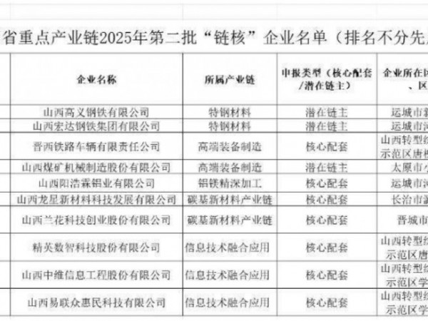 山西省重点产业链2025年第二批“链核”企业名单