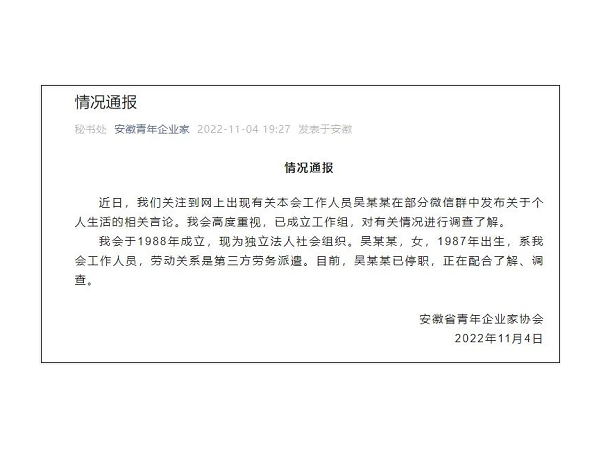 安徽省青年企业家协会:吴某某已停职配合有关事件调查