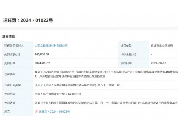 山西立铂隆新材料有限公司因发生生态环境违法行为被运城市生态环境局罚款14万元