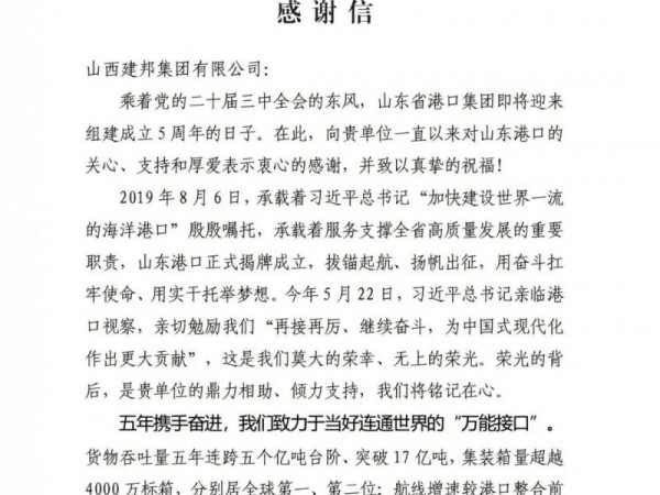 山东省港口集团向中国民企500强山西建邦集团发了一封感谢信