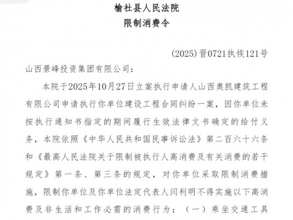 山西景峰投资集团及法人代表闫利明被限制高消费