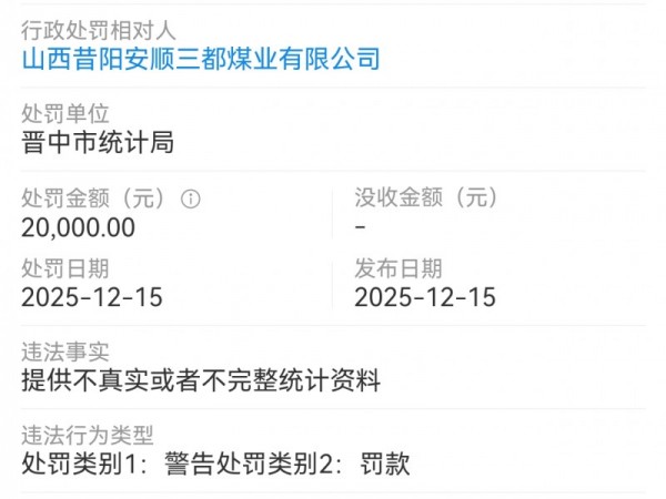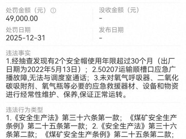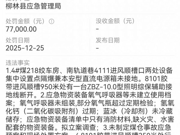 山西柳林鑫飞贺昌煤业被处罚4.9万