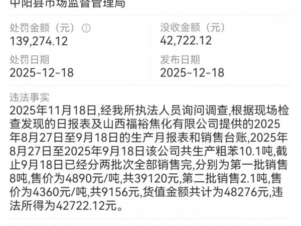 山西福裕焦化被处罚13.9万多 公司员工近800人