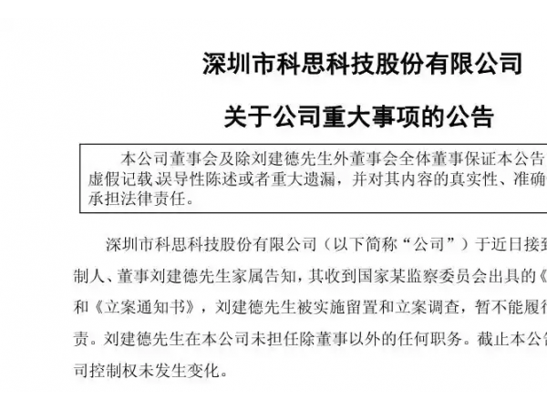 科思科技实控人被立案调查并实施留置,一个月前刚卸任董事长一职