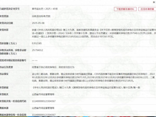 山西国金电力因不执行政府指导价、政府定价行为被罚没30余万元