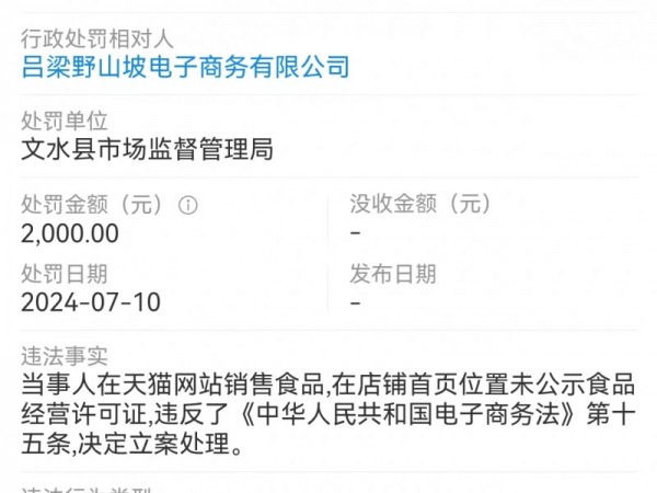 山西吕梁野山坡电子商务有限公司被罚款 2000 元