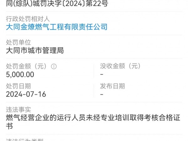 山西大同金燎燃气工程有限责任公司被罚款5000