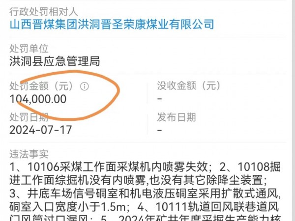 山西晋煤集团晋圣荣康煤业,3个月内被处罚2次,罚款21万