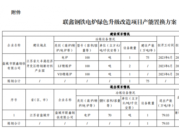 联鑫钢铁电炉绿色升级改造项目产能置换方案公告