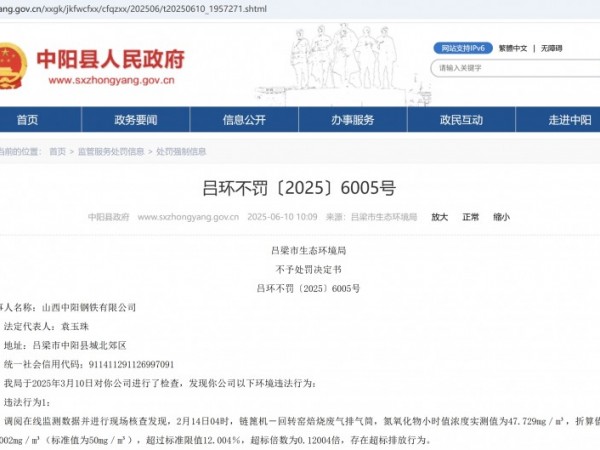 吕环不罚〔2025〕6005号——山西中阳钢铁有限公司