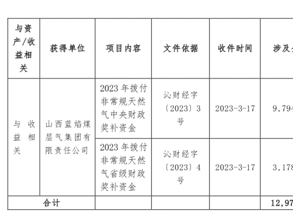 山西蓝焰煤层气集团有限责任公司收到政府补助约1.297亿元