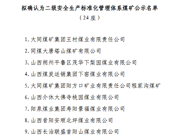 山西拟确认24 座煤矿为二级安全生产标准化管理体系煤矿