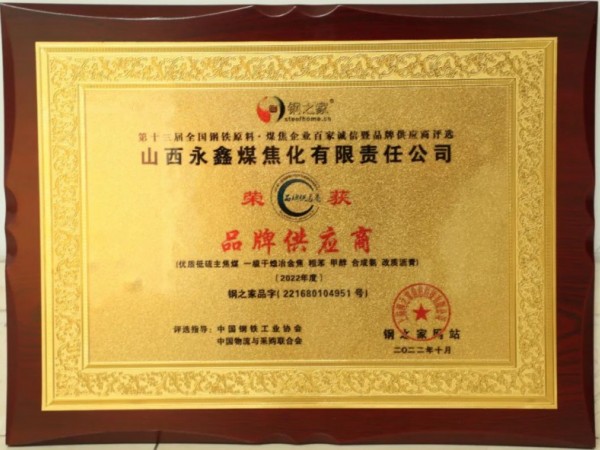 山西永鑫焦化荣获第十三届全国钢铁原料•煤焦企业百家诚信暨品牌供应商