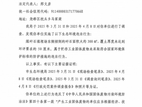 山西煤炭运销公司金辛达煤业因300平米煤矸石被罚39万