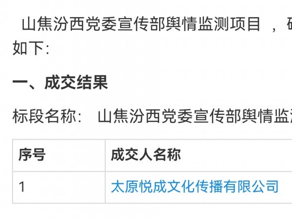 太原悦成文化传播中标山西汾西矿业集团舆情项目