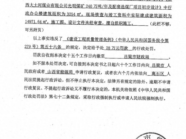 山西大土河煤业有限公司被山西吕梁能源局处罚了28万