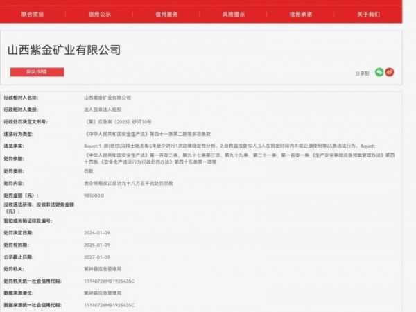 存在65条违法行为,山西紫金矿业再被重罚98.5万元