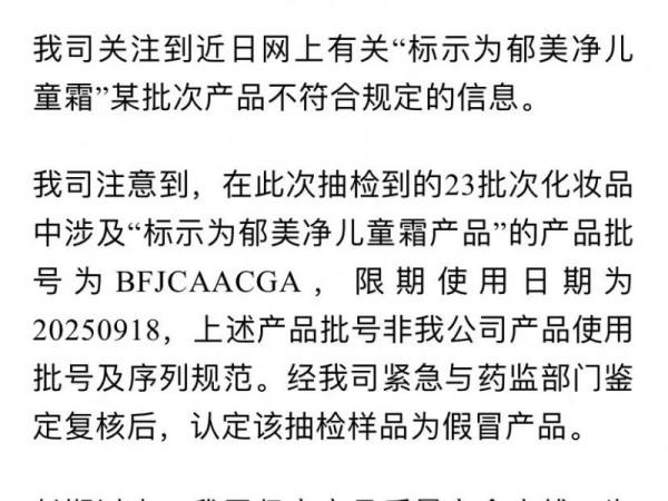 郁美净回应产品不合格