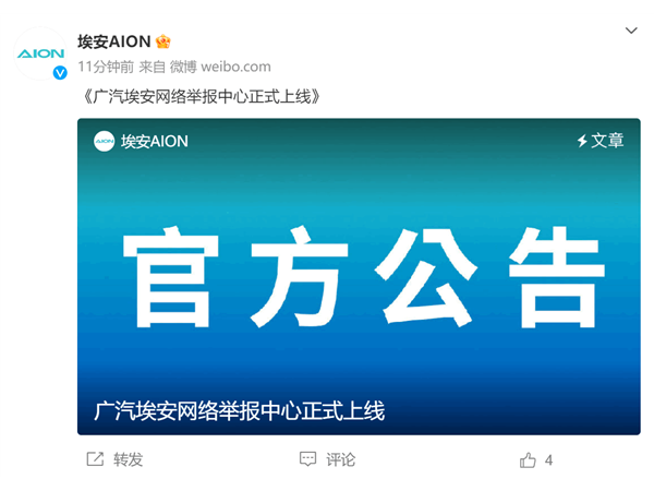 广汽埃安网络举报中心今日上线 举报者最高奖励100万元