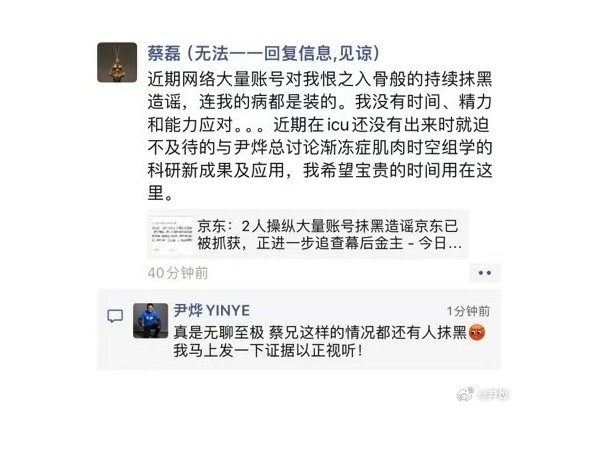 蔡磊称想在死前救下100万人!尹烨晒ICU照片:万万想不到 连他还有人造谣抹黑