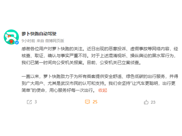 萝卜快跑回应在武汉致堵车遭投诉:经核查取证 确认与事实严重不符