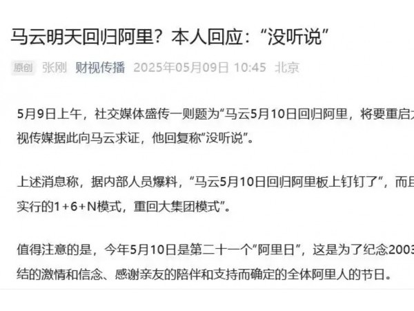 马云回应“5月10日回归阿里”传闻,1个月前戴新工牌亮相园区