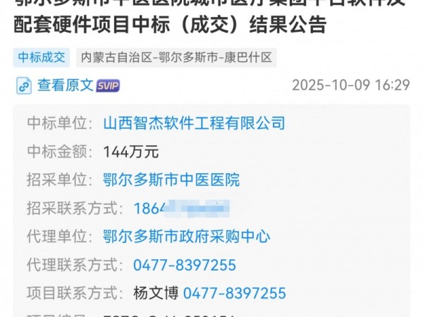 山西智杰软件144万中标鄂尔多斯市中医医院项目